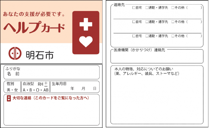 ヘルプカードは、緊急連絡先や必要な支援等を書くことができるカードです。災害時等に周囲の人に見せることで支援を受けやすくすることができます。 |