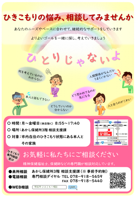 2022年4月より、「明石市ひきこもり相談センター」があかし保健所相談支援課内に設置されました。