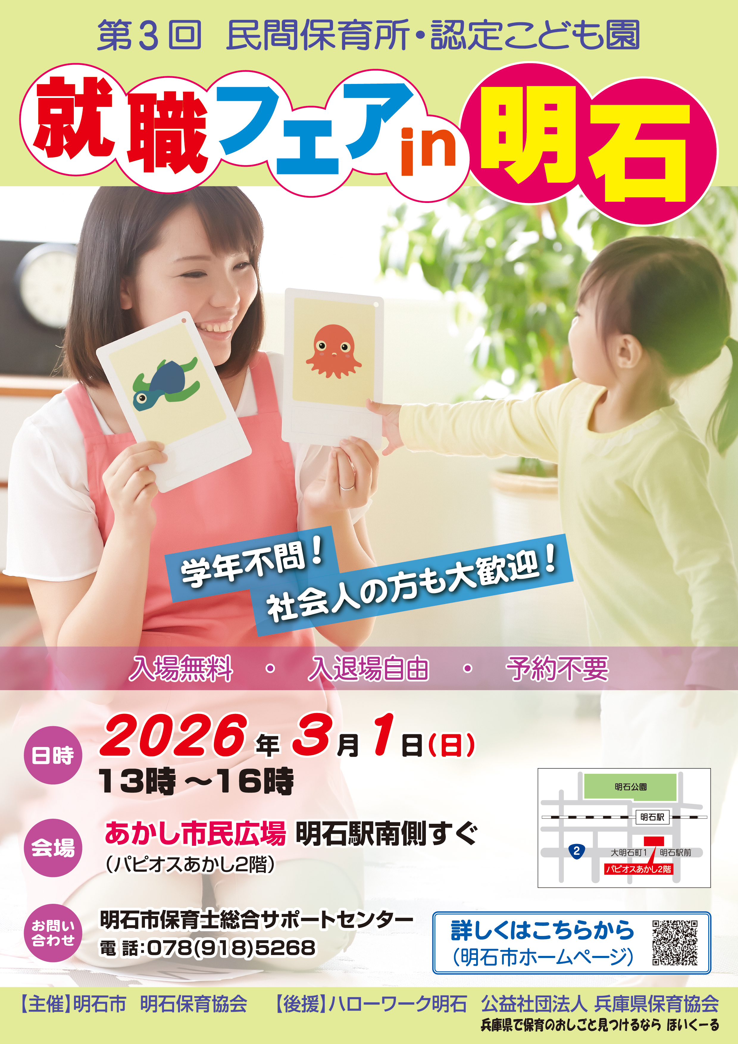 保育士としての就職を目指す方と、明石市内の民間保育所や認定こども園とをつなぐ保育士就職フェアを開催します。