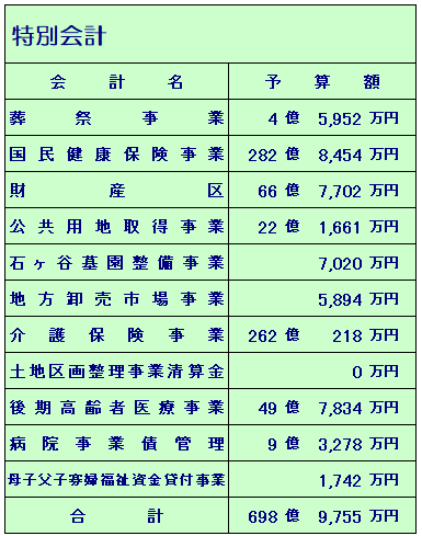 次に、特別会計の当初予算につきましては、財産区や後期高齢者医療事業の増がある一方、国民健康保険事業や公共用地取得事業の減により、対前年度比1.7%の減(12億3,476万円の減)となっています。