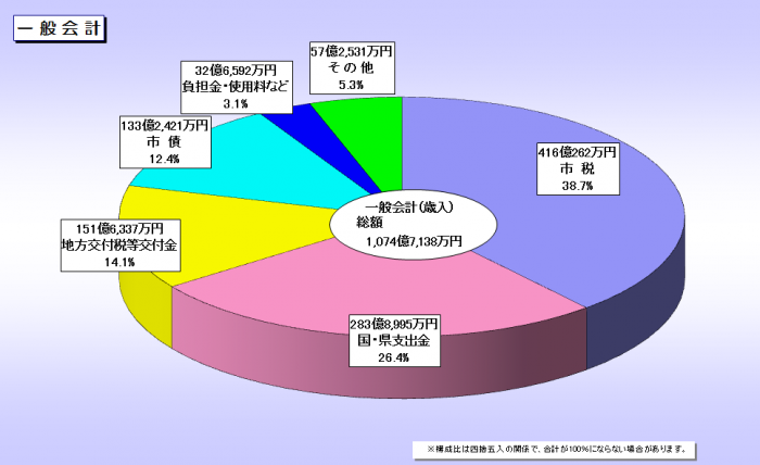 歳入は1,074億7,138万円で、前年度に比べ、56億1,999万円の増加です。主な要因は、市税が法人市民税の増などにより約11億3千万円、市債が明石駅前南地区市街地再開発事業費などの投資的経費の財源分の増加などにより約28億9千万円増加する一方で、分担金及び負担金が保育料の第2子以降完全無料化及び公立保育所保護者負担金の使用料への科目変更などにより約5億5千万円、地方消費税交付金が輸入される貨物にかかる貨物割の減少などにより約4億7千万円減少したことなどによります。